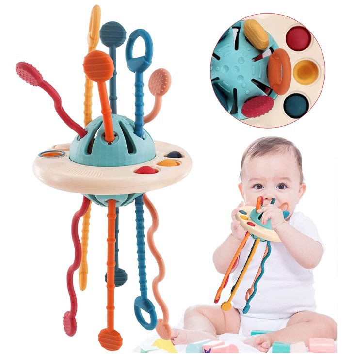 2. Montessori ufo silikonska igračka za povlačenje kao edukativne igračke za djecu stariju od godinu dana, igračke za putovanja za djecu stariju od godinu dana, igračke za razvoj za bebe, igračke za malu djecu za putovanja avionom; dječje igračke za putovanja za avione i Montessori igračke za bebe između šest i dvanaest mjeseci. Senzorna igračka je prenosiva i idealan je drug u igri za vaše dijete kada je vani.